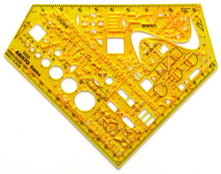 Electrosjabloon, voor school en universiteit. Schakelschema symbolen voor elektronische bouwkunde. Formaat 155x155x1,3mm