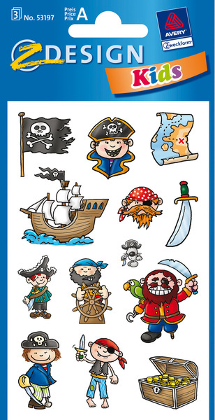 Kleurrijke papieren stickers, deels met glitters of reliëf. Formaat vel 76x120mm. Aantal vel 3. Motief piraten.