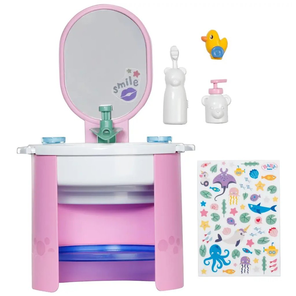 De interactieve wasbak is speciaal ontworpen voor kleine poppenouders die graag zorgen voor hun babypop. Dankzij de mechanische waterpomp stroomt er echt water uit de kraan, waardoor het speelplezier levensecht wordt. De set bevat een trillende tandenborstel, een zeepdispenser, een tandenborstelbeker en een vrolijke eend-stop. Versier de wasbak en accessoires met het meegeleverde stickervel en maak van elke poetsbeurt een feestje. Geschikt voor kinderen vanaf 3 jaar.