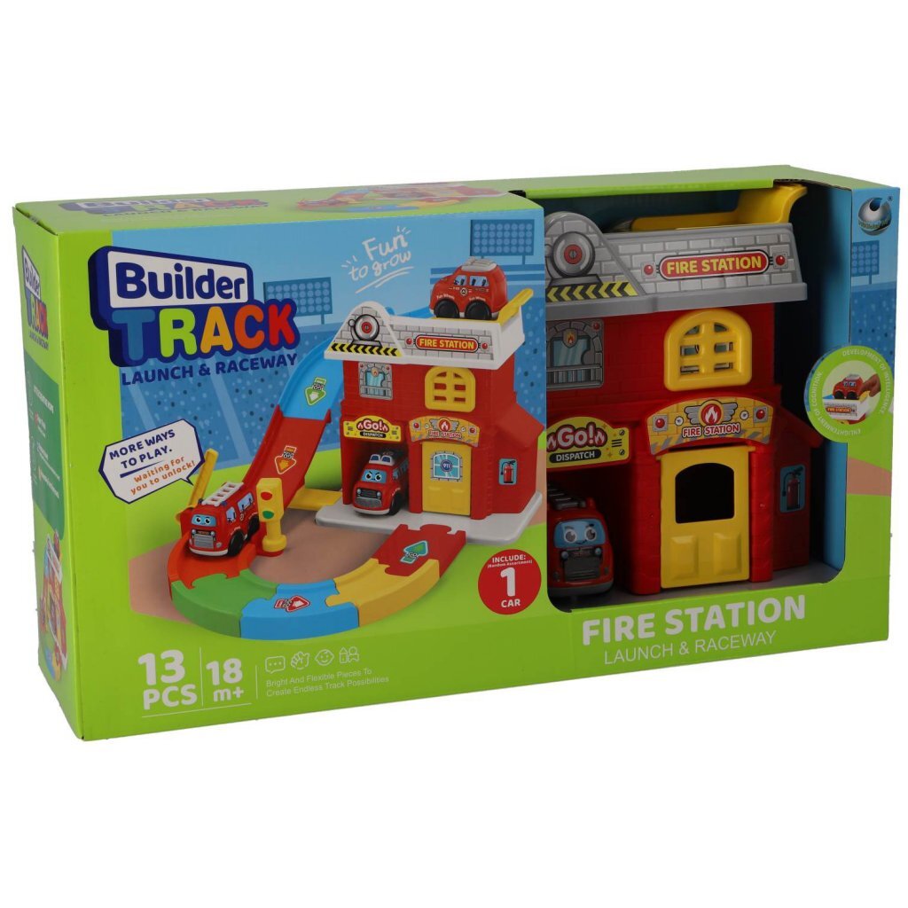 Kom in actie met deze mooieBuilder Track brandweerkazerne met voertuig, 13-delig. Geschikt voor kinderen vanaf 18