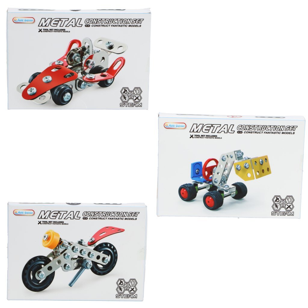 Constructieset metalen voertuigenDeze set bevat alles wat kinderen nodig hebben om hun eigen voertuigen te bouwen.