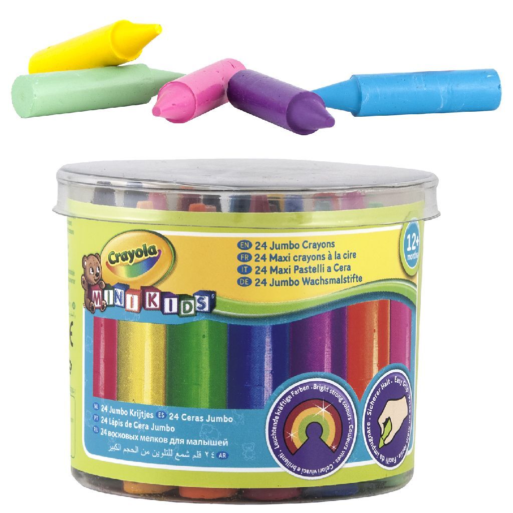 Deze 24 dikke waskrijtjes van Crayola Mini Kids zijn speciaal voor kleine handjes gemaakt: sterk, heel gemakkelijk te hanteren en kleurvast. Afwasbaar van huid en kleding. Geschikt voor kinderen vanaf 1 jaar.