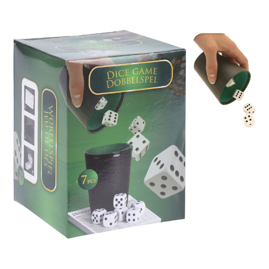 DobbelspelDe set bestaat uit dobbelbeker met 5 dobbelstenen en een scoreblok. Voor 1 tot 6 spelers