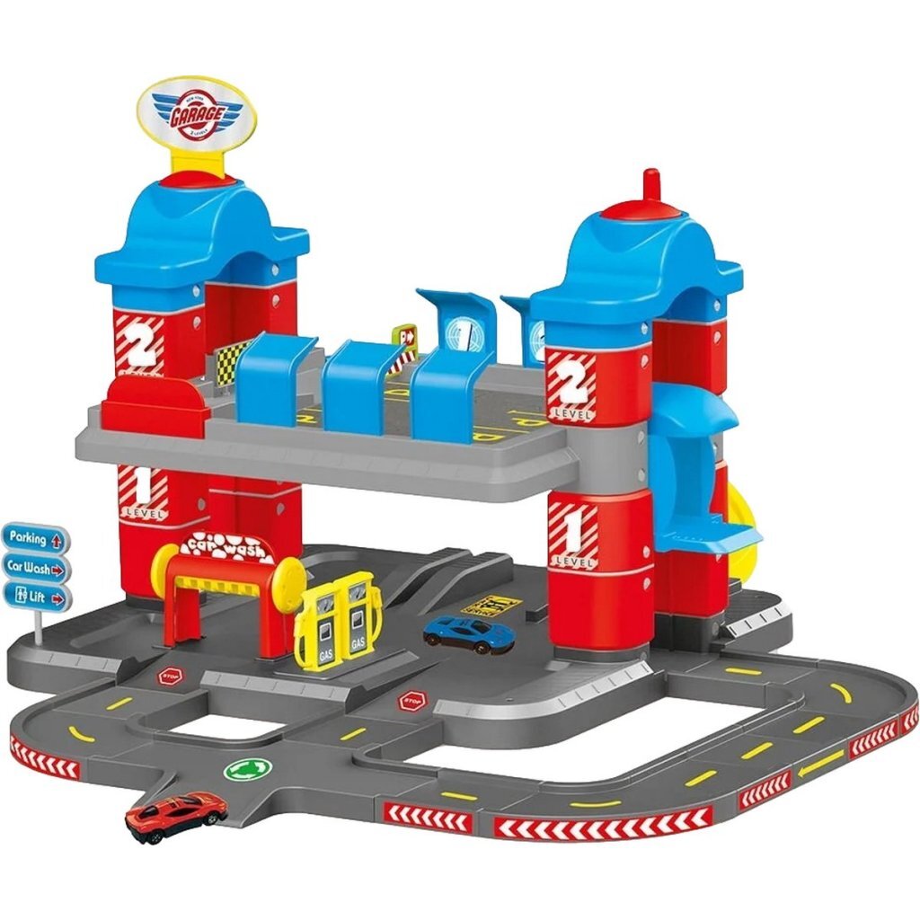 Deze uitgebreide speelset heeft twee etages waar je kindje al zijn favoriete auto’s kan parkeren. De parkeerlagen zijn met elkaar verbonden met een snelle glijbaan, dat wordt leuk! De parkeergarage heeft zelfs een makkelijk bedienbare lift waarmee de autootjes naar de juiste verdieping kunnen worden getild. De verschillende accessoires zoals een benzinestation en diverse verkeersborden maken de speelset helemaal af! De set bevat daarnaast al 2 stoere auto’s waar je kindje mee kan rondrijden. Geschikt voor kinderen vanaf 3 jaar.