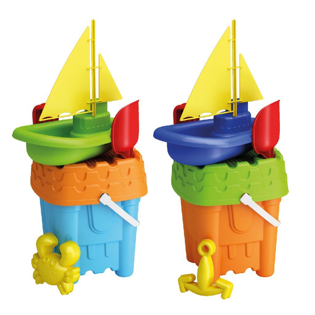 Zes-delige emmerset in frisse kleuren. Hiermee kun je de mooiste zandkastelen bouwen: graaf ook een gracht om met je bootje in te varen! De strandset bestaat uit een vierkante kasteel-emmer met hengsel, zeef, boot, harkje, schepje en een zandvompje. De emmer heeft een hoogte van 15 cm. Geschikt voor kinderen vanaf 2 jaar. Verkrijgbaar in verschillende uitvoeringen. U kunt niet kiezen, maar ontvangt een willekeurige uitvoering.