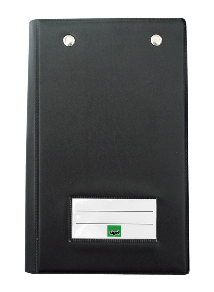 Kassablokhouder. Met 2 metaalklemmen voor de bevestiging van kassablokken of enkele bladen. Formaat 180x115mm (hxb). Buitenzijde heeft een doorzichtig venster voor een opschrift. Met pennenvak. Kleur zwart.