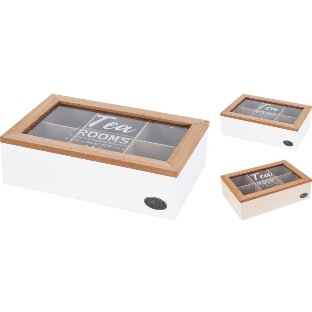 Houten theedoos met 6 vakjes, kleur: wit/naturel