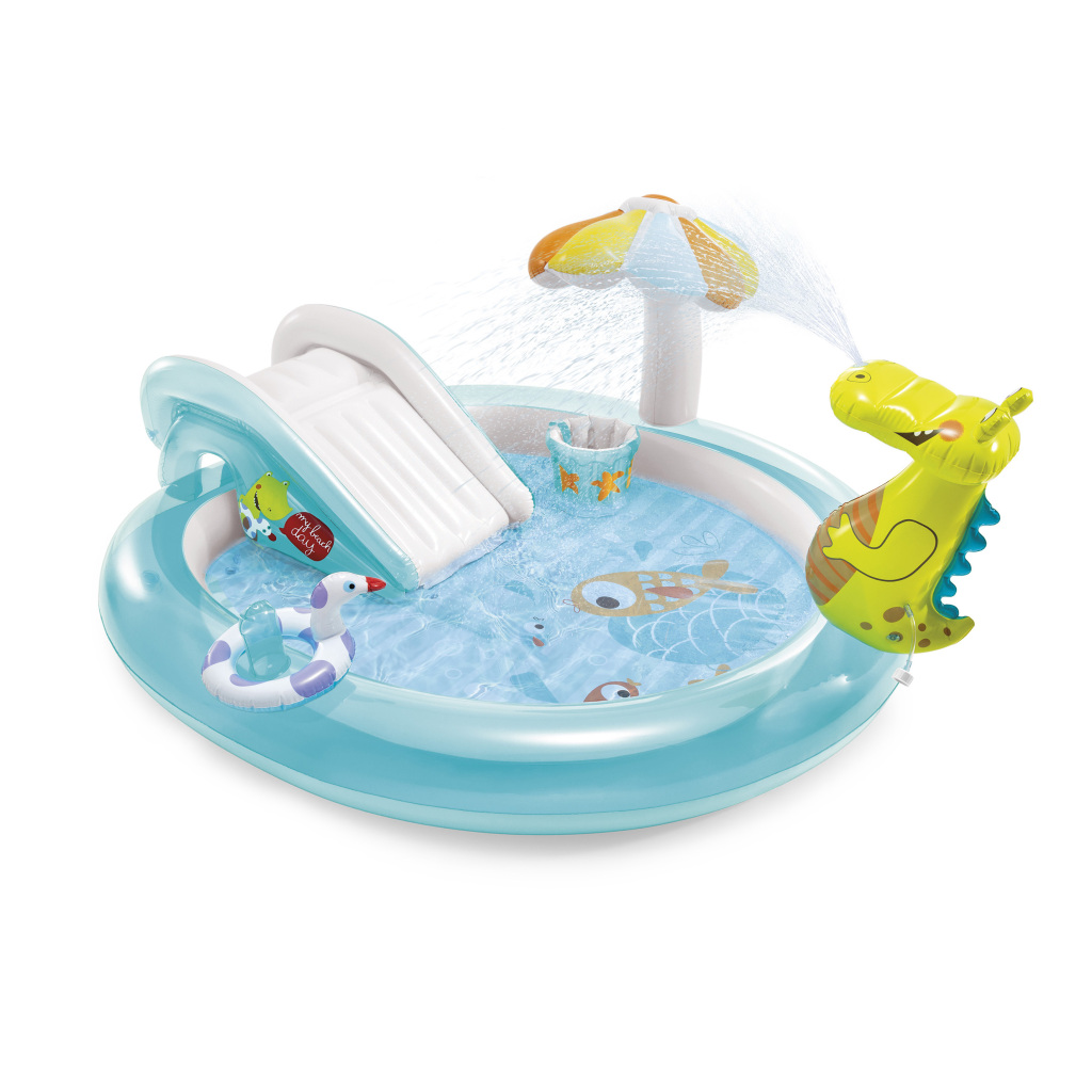 Intex 57165 krokodil zwembadHet zwembadje heeft een paddenstoel als parasol, een glijbaan, emmer en een opblaasbare
