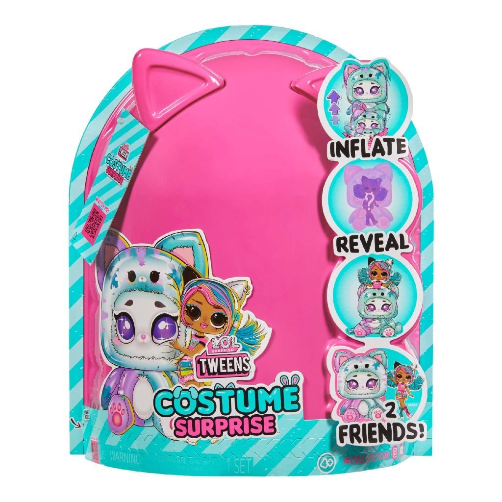 Bereid je voor om de ultieme verrassing uit te pakken met de gloednieuwe L.O.L. Surprise Tweens Costume Surprise met de populaire modepop Emma Emo in een nieuwe look en met een schattig, opblaasbaar kittenkostuum. Ontdek wat erin zit door eerst de rits onder in de verpakking open te trekken en het buitenste, roze omhulsel op te tillen. Nadat het helemaal is opgeblazen, scheur je het open om een lief, blauwgroen kittenkostuum te ontdekken! Open het klittenband op de achterkant van het kittenhoofd om je schitterende Tweens Emma Emo-pop te onthullen! Vergeet niet om de unieke verrassingen uit te pakken en haal de Tweens-pop uit haar poppenstandaard om haar de trendy, nieuwe mode en accessoires aan te trekken, zoals een modieuze rok, stijlvolle hoofdtelefoon met kittenoren die bij haar knuffelige kostuum passen en kleurrijke, elegante schoenen! Sluit het dierenkostuum en kijk hoe het groter wordt en zichzelf helemaal opblaast, waardoor je twee maatjes hebt om mee te spelen: Emma Emo en haar kittenkostuum!