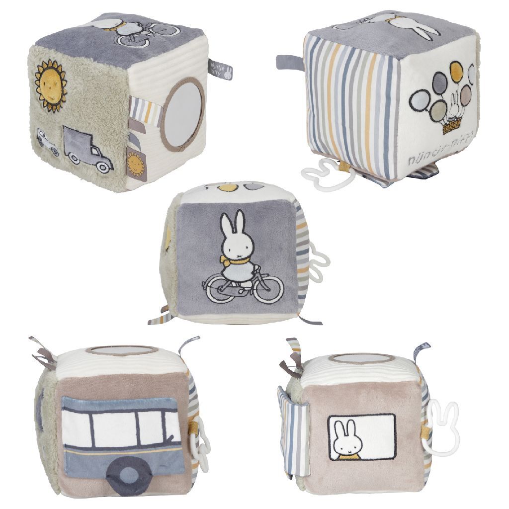 Je kindje zal zich niet snel vervelen met deze leuke activiteitenkubus in blauw tinten. Op elke zijde van de kubus is iets anders te ontdekken zoals leuke afbeeldingen, verschillende stoffen, labeltjes om aan te voelen, een spiegeltje en een siliconen Nijntje ring. Ook zit er binnenin de kubus een belletje voor een leuk rammeleffect.