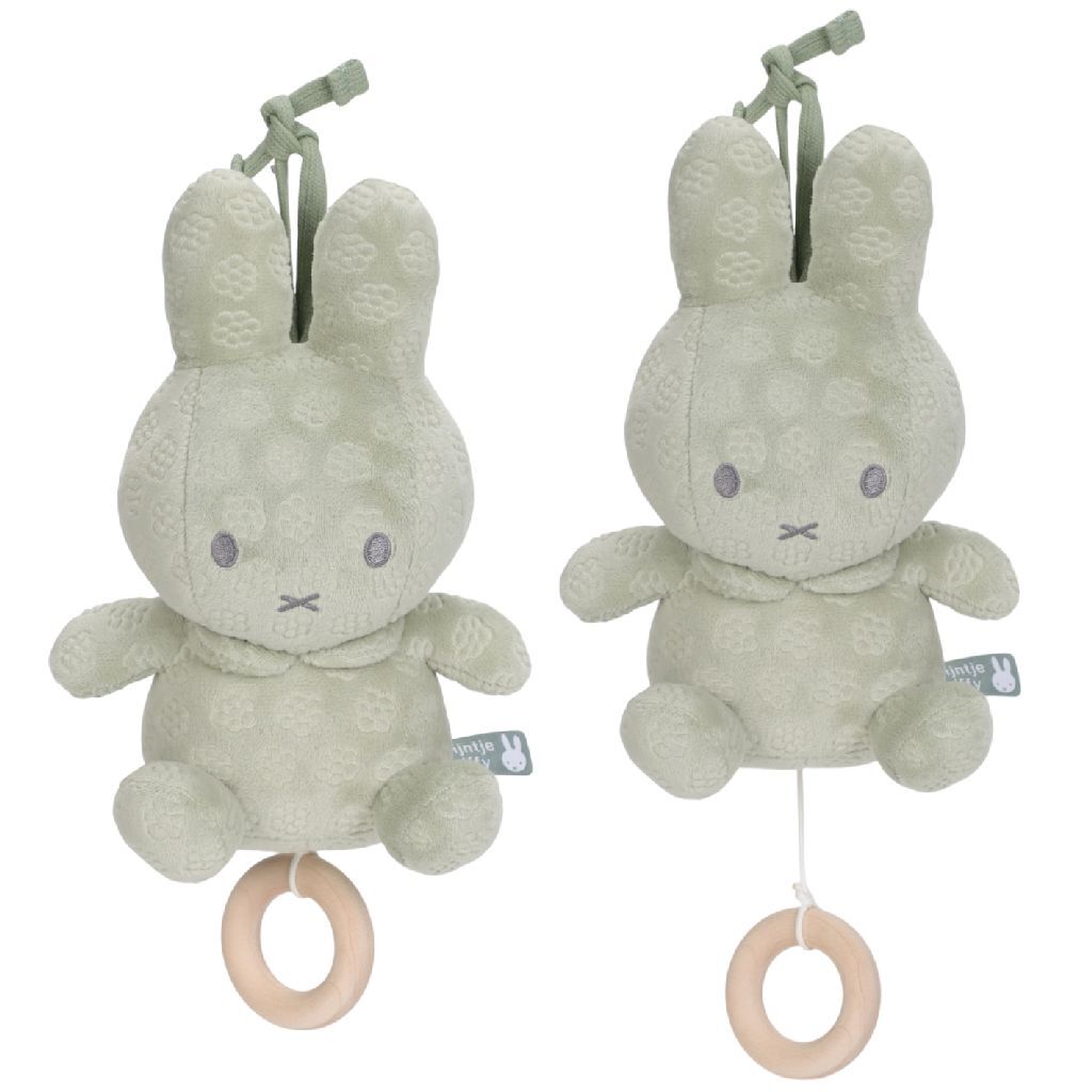 Nijntje, lief klein konijntje. Speel de melodie van het bekende Nijntje deuntje af door aan het touwtje te trekken. Door de zachte stof, met gestanste bloemetjes, is dit muziekdoosje een echte aanwinst voor in de wieg of aan de box. Het muziekdoosje is eenvoudig te bevestigen door middel van het lusje. Kleur: groen. Leeftijd: vanaf de geboorte.