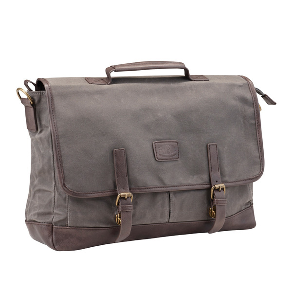 Pride and Soul aktetas met handvat, afneembare schouderriem. Twee opbergvakken vooraan en opbergvak met rits op de rug, ruim hoofdcompartiment. Binnenin: twee opbergvakken en compartiment voor laptop. Kleur grijs-bruin. Afmeting: 32 x 42 x 13 cm. Materiaal canvas/imitatieleer.