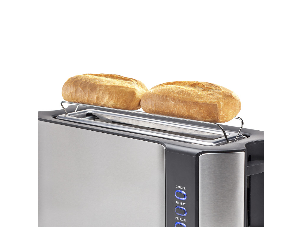 Luxe broodrooster geschikt voor 2 grote sneden of bijv. panini brood. Voorzien van een regelbare thermostaat, met 6 verschillende bruiningsgraden en broodjesrek. Uitgevoerd met een ontdooi-, opwarm- stop-functie en kruimellade.