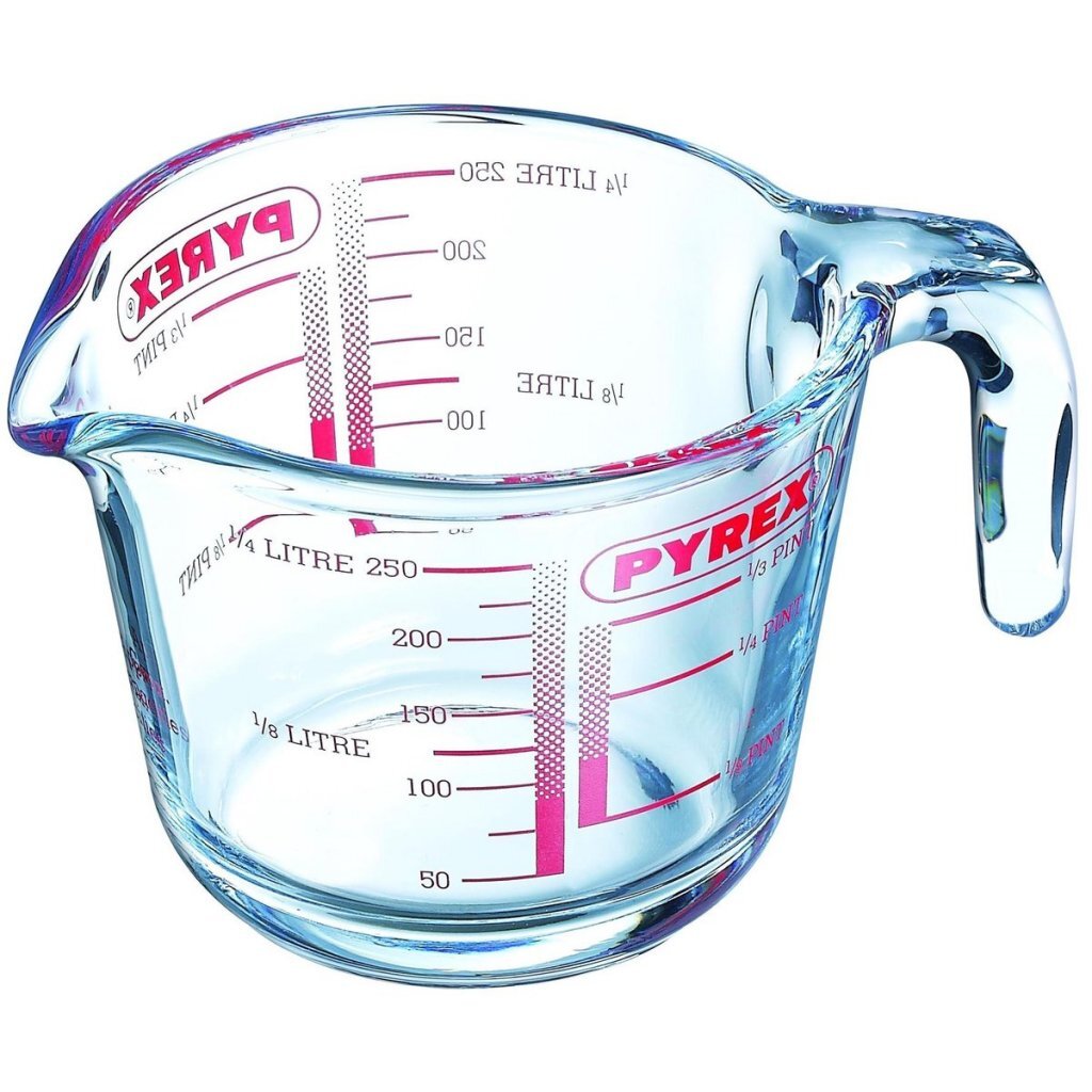 Pyrex glazen maatbekerDeze keukenhulp, gemaakt van sterk borosilicaatglas is perfect voor het afmeten van zowel koude-