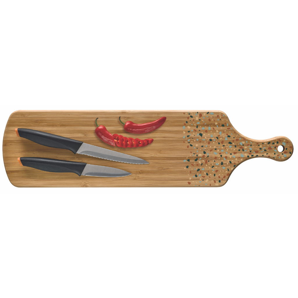 Deze set met terrazzo snijplank en messen is een echte keuken musthave. Snij aan de ene kant van de snijplank en gebruik de moderne, gedecoreerde kant om in stijl jouw heerlijke zelfgemaakte hapjes te serveren. De natuurlijke bamboe snijplank met terrazzo print is een veelzijdige en sfeervolle toevoeging om van jouw borrelmoment een succes te maken.