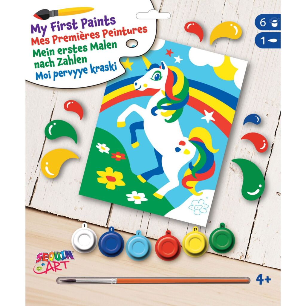 Sequin Art schilderen op nummer eenhoorn met 6 kleuren verf en penseel. Geschikt voor kinderen vanaf