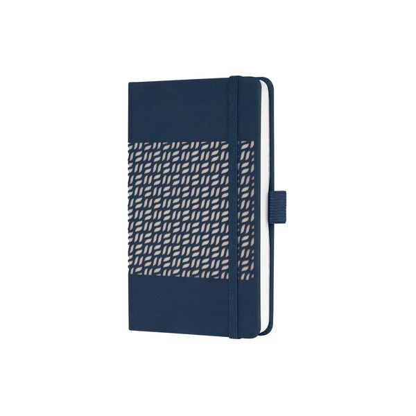 Notitieboek met wit gelinieerd papier, 80grs (zuurvrij, houtvrij en elementair chloorvrij). 174 pagina’s waarvan 16 geperforeerd. Het notitieboekje is voorzien van penlus, elastieksluiting, leeslint en opbergvak. De cover is gemaakt van zacht kunststof met een 3D effect. Formaat A6: 95x150x16mm. Kleur ‘Midnight Blue’.