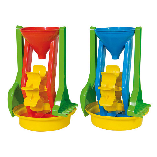 Vierdelige strandset, bestaande uit een zandmolen, een zeefje, harkje en schepje, Wordt in twee assorti uni