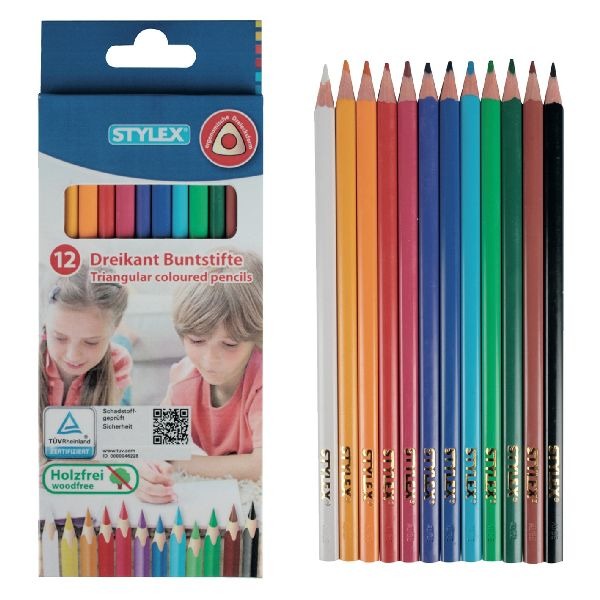 Stylexdriehoekige lange kleurpotloden 12 stuks in kartonnen doosje Houtvrij, gelakt