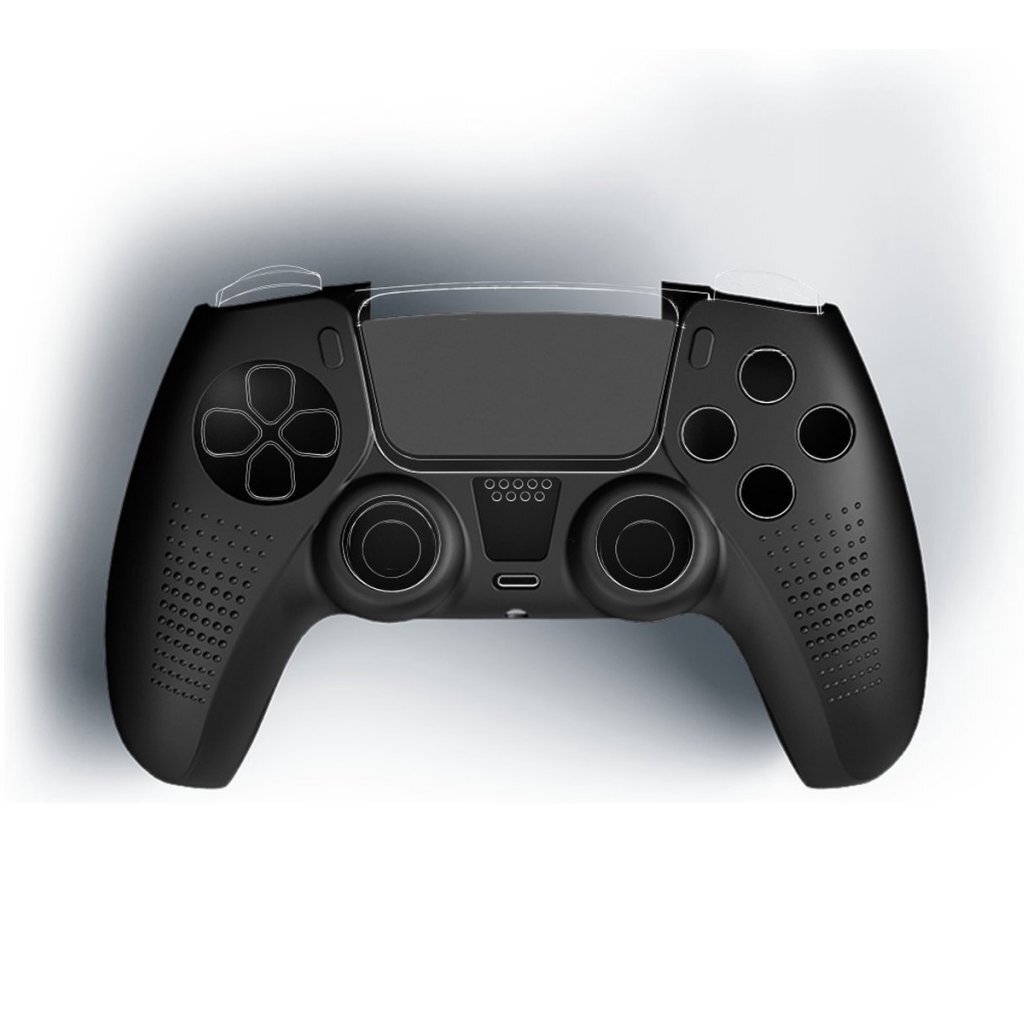 - Bescherming voor de PS5-controller in cool zwart, bestaande uit een flexibele beschermhoes en touchpad-beschermfolie