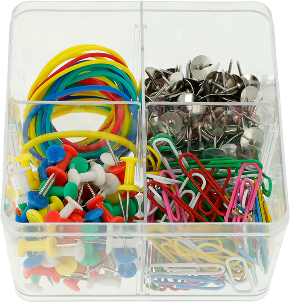 Deze 4 in 1 multifunctionele box van Westcott is ideaal voor gebruik op kantoor of thuis. De herbruikbare doos bevat 4 compartimenten met verschillende buro accessoires. Of het nu gaat om spelden, punaises, paperclips of elastiekjes, de kleine helpers organiseren uw dagelijkse kantoorleven perfect en zijn tegelijkertijd ook nog eens kleurrijk. De doos bevat 390stuks accessoires: 100 gekleurde paperclips, 200 zilveren punaises, 60 gekleurde pins en 30 gekleurde elastieken.